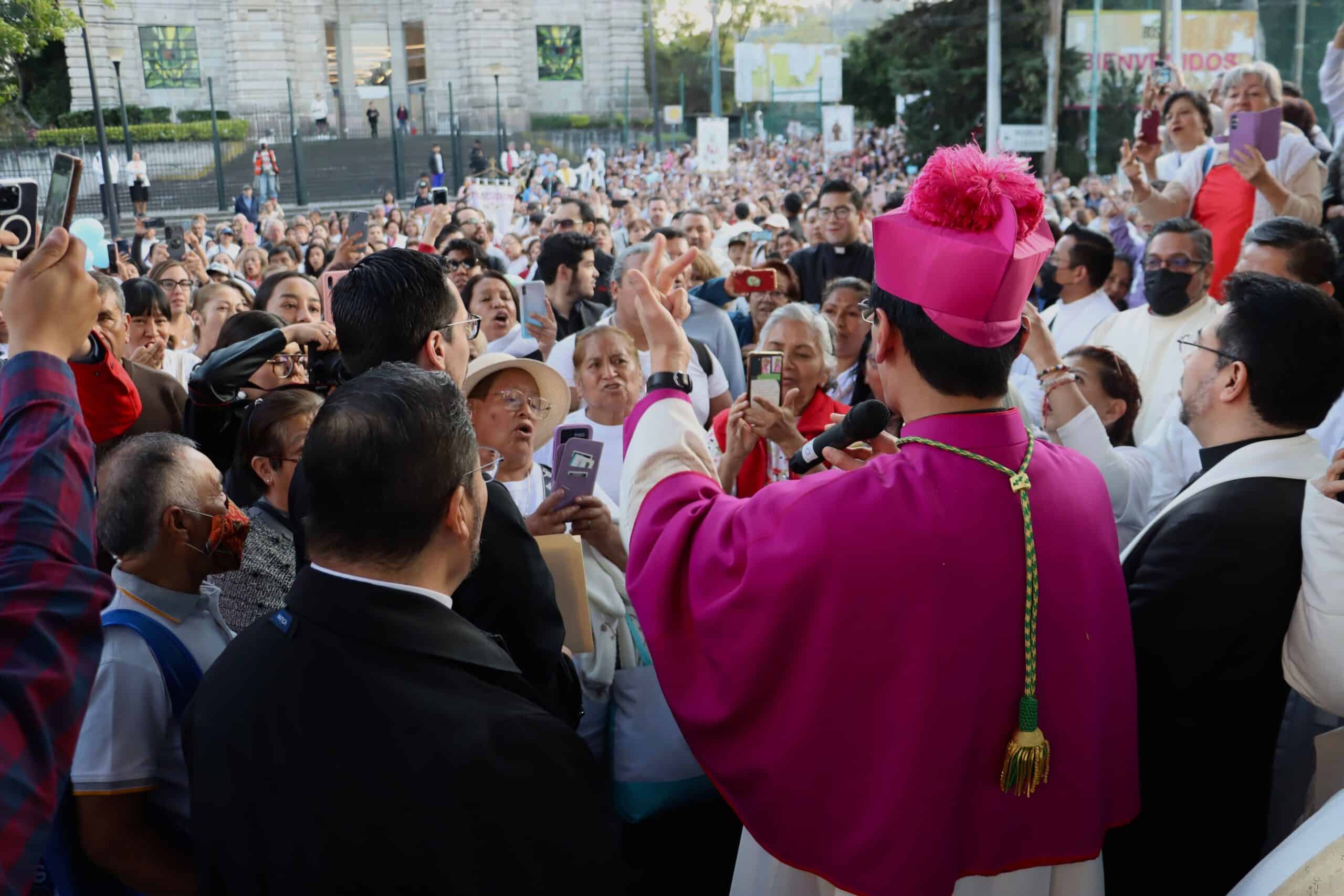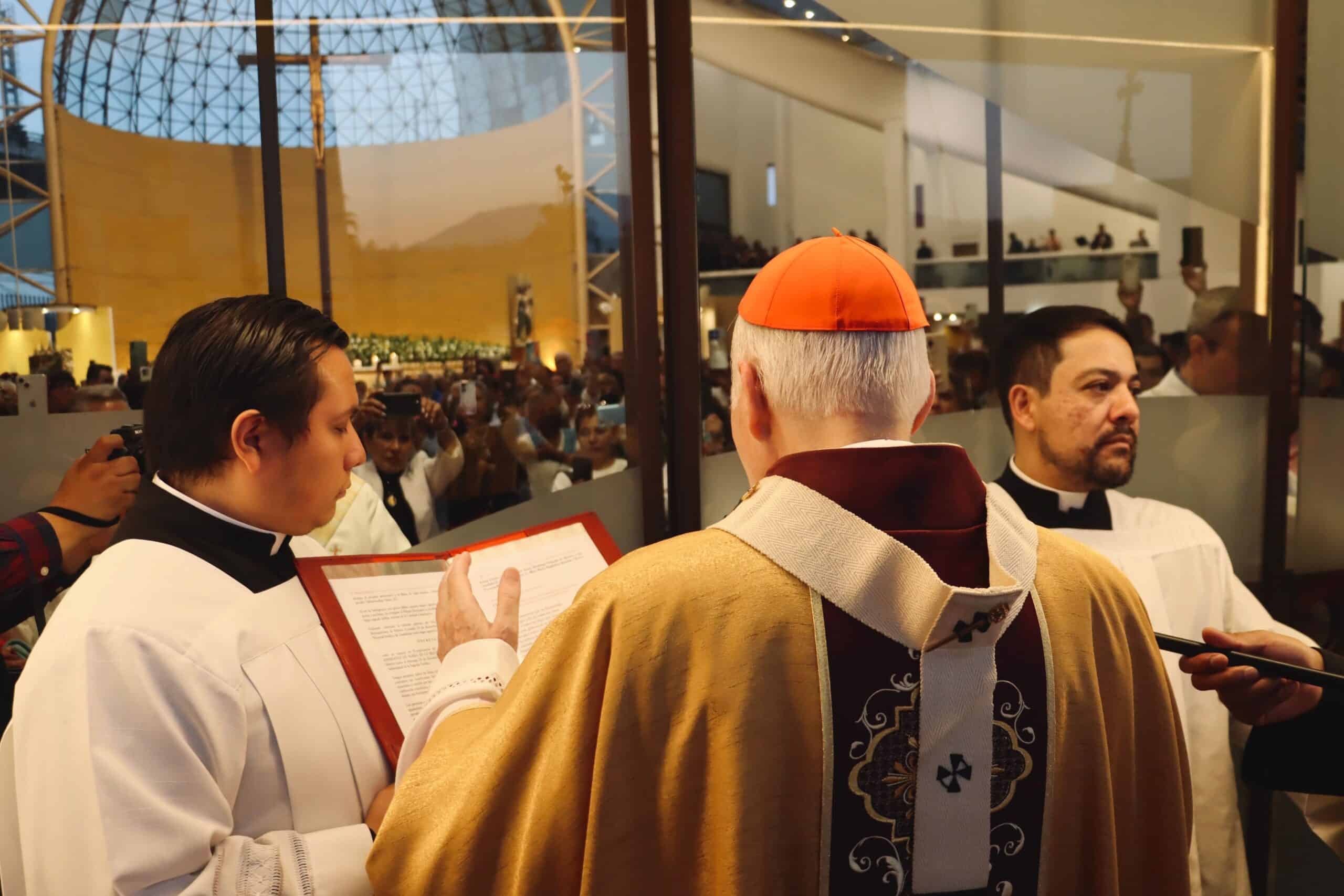Acto seguido, el Cardenal tomó un Báculo y, con gran solemnidad, tocó tres veces la puerta de la iglesia. Después del tercer toque, las puertas se abrieron de par en par, permitiendo la entrada del Arzobispo Primado de México y de todo el presbiterio. Dentro, el templo ya estaba con cupo lleno, repleto de fieles que aguardaban el momento con devoción. Sin embargo, algunos peregrinos que permanecían afuera lograron ingresar en el último momento.
