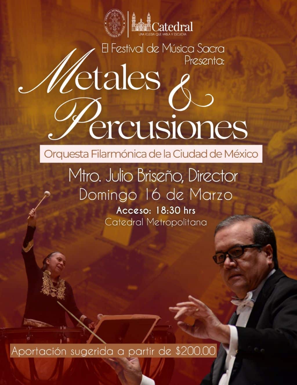 El Concierto de Metales y Percusiones de la Orquesta Filarmónica de la Ciudad de México, dirigido por el maestro Julio Briseño, se llevará a cabo en el marco del Festival de Música Sacra el domingo 16 de marzo de 2025 en la Catedral Metropolitana de la Ciudad de México, el acceso será a las 18:30 horas y la aportación sugerida será a partir de $200.00.