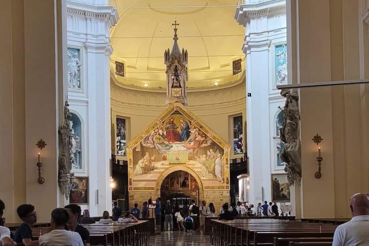 Para custodiar este santuario, el Papa Pío V ordenó en 1568 la construcción de la imponente Basílica de Santa María de los Ángeles, una de las más grandes del mundo. Bajo su cúpula se levanta la diminuta Porciúncula, con una inscripción en el suelo que proclama: Hic Locus Sanctus (“este lugar es santo”).