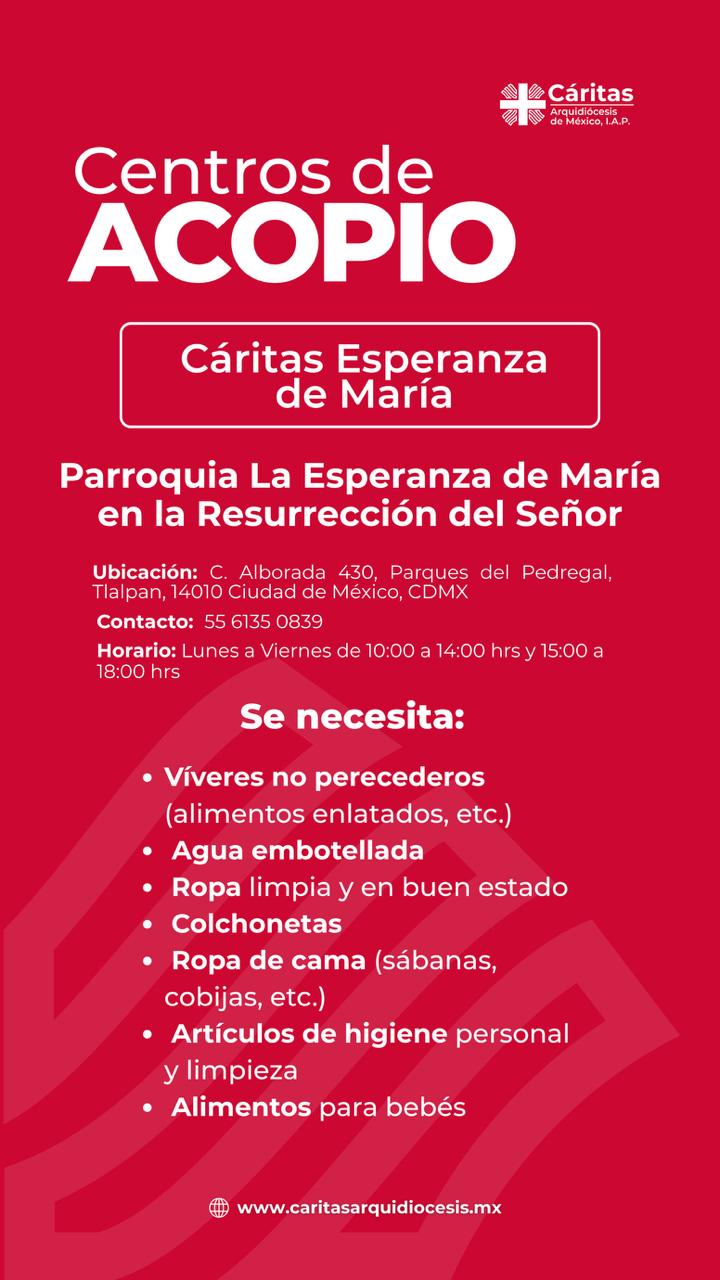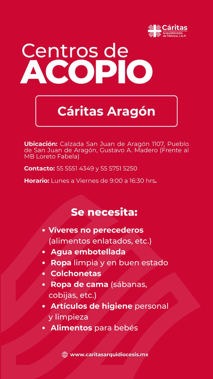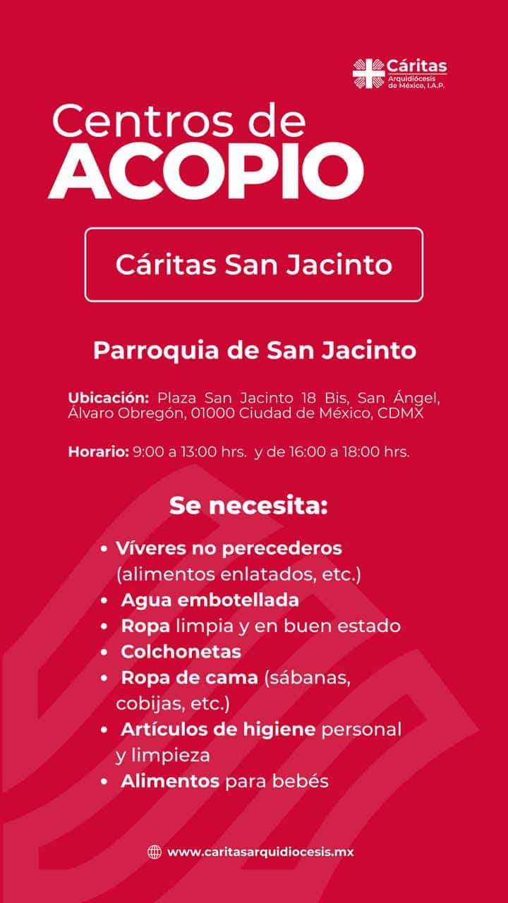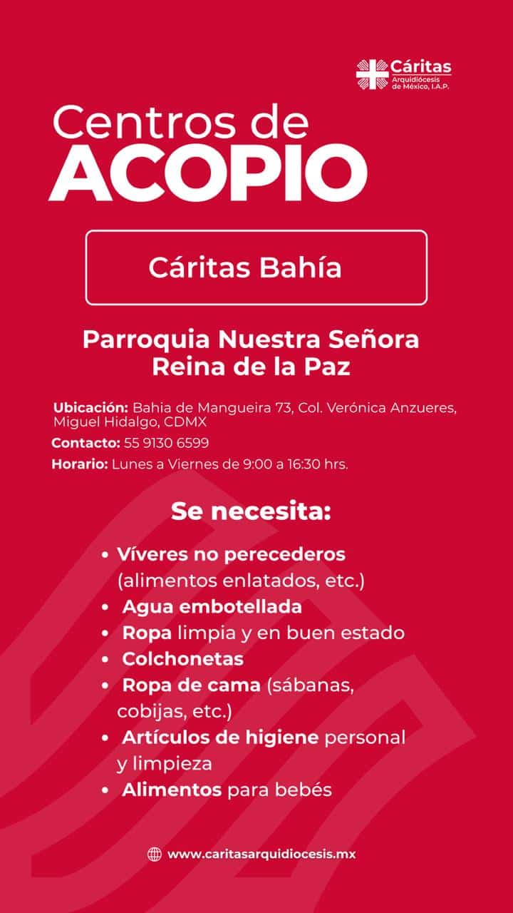Con el propósito de apoyar a las personas damnificadas en estos estados, la Arquidiócesis de México habilitó centros de acopio organizados por Cáritas, en los que la ciudadanía puede llevar alimentos y artículos de primera necesidad. Te contamos dónde están ubicados estos puntos en la Ciudad de México.