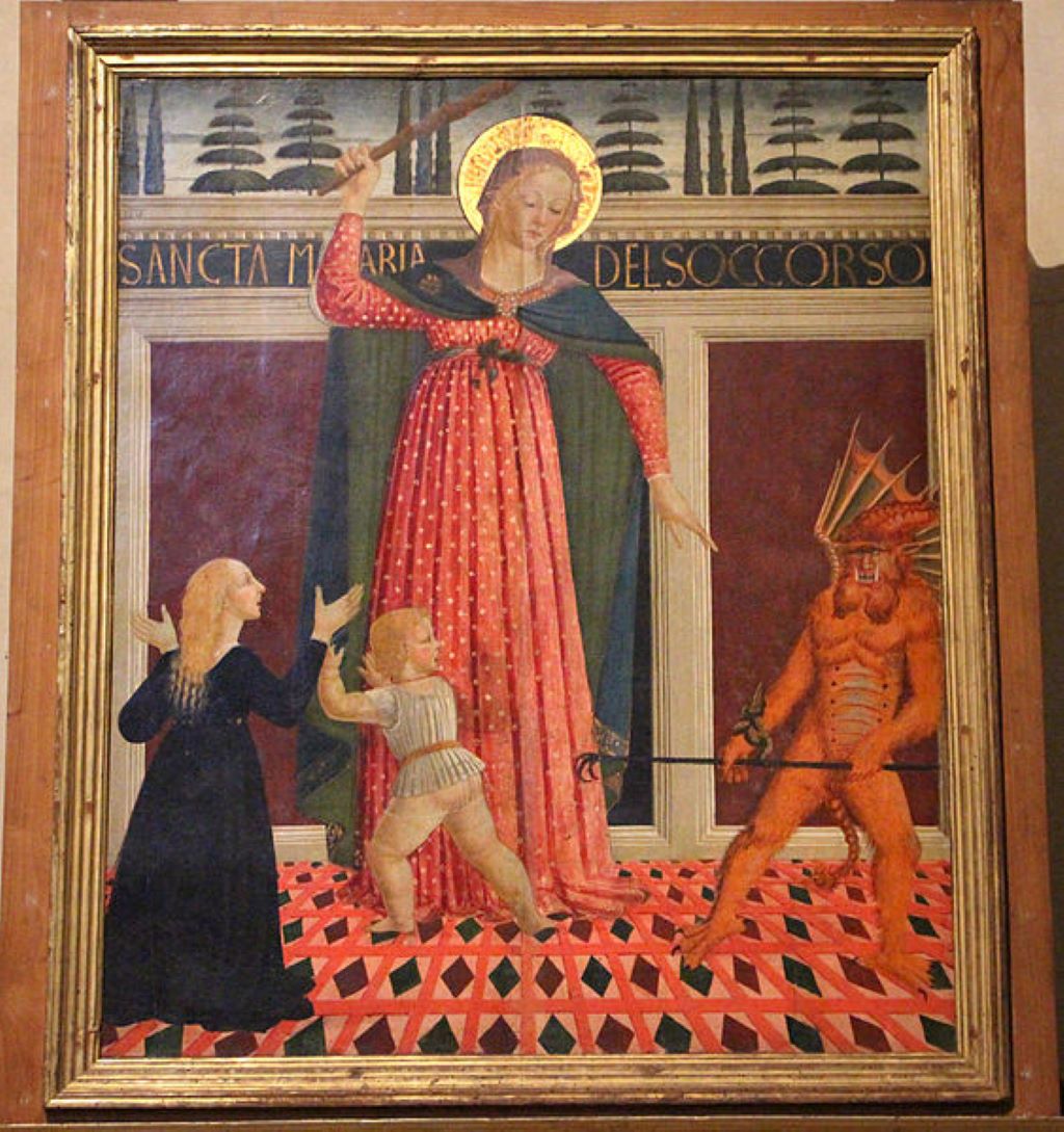 Ante el arrepentimiento y en respuesta a la plegaria de la madre, la Virgen María acudió en su ayuda ahuyentando al enemigo infernal con un palo con el que golpeó al demonio hasta que soltó al pequeño y lo acogía bajo su manto, para que después regresara a los brazos de su mamá.